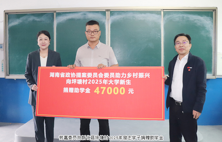 湖南省政协副主席赖明勇一行在坪塘村、油溪桥村、新化县吉庆有余农业有限公司、湖南清山纸业有限公司等地调研。召开座谈会与工作队队员、村“两委”班子成员、学生家长代表进行深入交流,详细了解坪塘村的产业发展、水利设施建设、农村饮水安全及乡村教育等情况,听取意见建议,为乡村发展出谋划策,并邀请相关专家在吉庆镇政府为当地产业带头人进行辅导授课。座谈会现场,湖南省政协副主席赖明勇,省政协提案委委员、绿之韵集团总裁劳嘉在胜利完小向13名坪塘村2025年大学新生捐资助学。