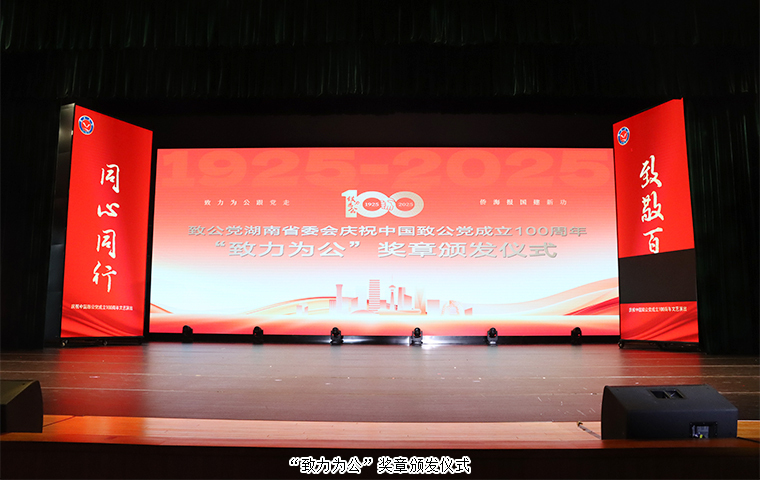 演出前举行了隆重的“致力为公”奖章颁奖仪式。在热烈的掌声中,胡国安董事长上台接受“致力为公”特别贡献奖章。颁奖辞写到:“2014年他荣获‘中华慈善突出贡献奖’,同年被评为‘第四届全国优秀中国特色社会主义事业建设者’。他的慈善之举温暖了无数人心,他的企业担当彰显了社会责任。2018年,他凭借在精准扶贫行动中的卓越贡献,获‘全国万企帮万村精准扶贫行动先进民营企业’称号。他用自己的力量,为社会和谐发展书写壮丽篇章。”此项荣誉正是对他多年来在参政议政、社会服务、侨海联络,特别是在公益慈善与乡村振兴等领域持续贡献的高度认可,充分体现了致公党湖南省委会对优秀党员坚守“致力为公、侨海报国”初心的肯定与褒扬。
