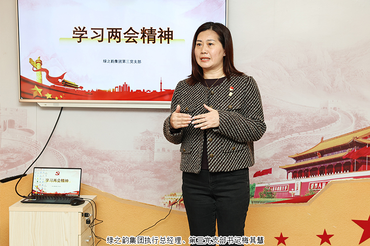 会上,绿之韵集团执行总经理、第三党支部书记梅其慧就学习内容分享了心得体会。结合两会精神,她表示在世界格局复杂多变的背景下,我们要珍惜来之不易的安定环境,以确定性应对不确定性,在明确战略方向的前提下,持续提升服务质量与管理水平,推动企业稳健发展。她希望大家将每次学习成果真正融入日常工作,做到学以致用、知行合一。