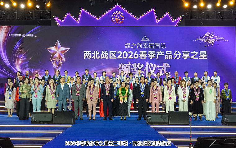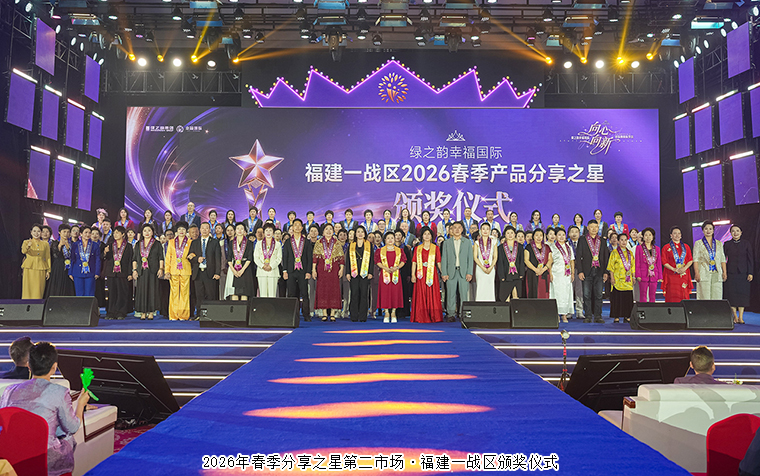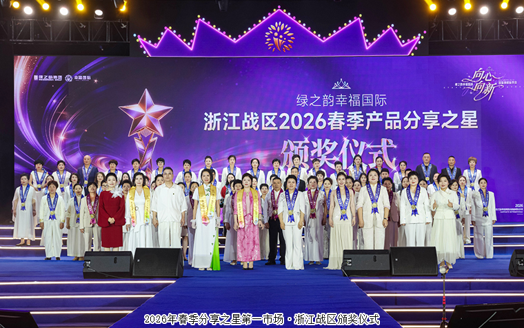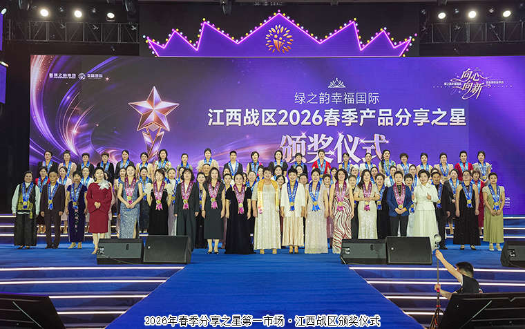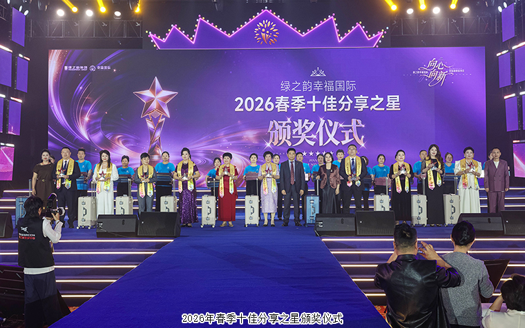 荣耀加冕,星光璀璨。在分享之星的光芒之上,有一群攀登至更高处的领跑者。他们用极致的热爱与持久的行动,站上了荣耀的顶峰。现场举行2026年春季分享之星颁奖盛典。绿韵悦喜智能科技有限公司总经理杨邢轩、绿之韵集团市场运营中心市场区域经理陈建辉依次为第五市场·广东战区颁发荣誉;绿之韵幸福国际市场商学院特聘教授、绿韵悦喜智能科技有限公司首席研发专家骆春岗,绿之韵集团市场运营中心区域业务总监王壮依次为第四市场·云贵战区、川渝战区颁发荣誉;绿之韵健康专家委员会专家委员、绿之韵幸福国际市场商学院院长侯俊霞,绿之韵集团市场运营中心区域业务总监黄姣为第三市场·两北战区、湖南战区颁发荣誉;绿之韵集团品宣部执行总经理龙雅凤、绿之韵集团市场运营中心市场业务总监喻鸣鸾依次为第二市场·福建一战区、福建二战区颁发荣誉;绿之韵集团运营部执行总经理·国际商学院常务副院长陈敏,绿之韵集团市场运营中心市场业务总监谭红依次为第一市场·浙江战区、苏皖沪战区、江西战区颁发荣誉。战区指导分别发表感言,字字滚烫,句句入心。随后,现场举行了2026春季十佳分享之星颁奖盛典,绿之韵集团运营总裁、幸福导师夏运良为2026年春季分享之星前十强颁发荣誉与奖品。360环拍记录下冠亚季军的高光瞬间,他们面对镜头,分享着深耕市场的心路历程,那些关于爱与责任的真挚表达,化作铿锵有力的誓言,奏响了属于绿之韵人的最强音,点燃全场激情。