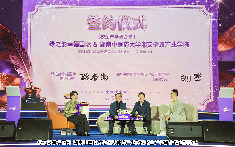 现场举行了绿之韵幸福国际与湖南中医药大学湘艾健康产业学院校企产学研合作协议签约仪式。绿之韵幸福国际市场商学院特聘教授、绿韵悦喜智能科技有限公司首席研发专家骆春岗与湖南中医药大学针灸推拿与康复学院副院长、湖南省针灸学会副会长刘密作为双方代表郑重签约。这份协议承载着校企双方的信任与期待,让绿之韵幸福国际得以拥抱学术资源,夯实产品根基,为2.0时代的品牌升级注入科研动能。