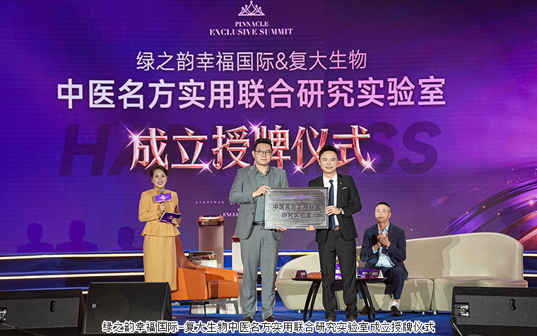 看见传承背后的匠心坚守,读懂专业背后的坚实力量。在“幸福圆桌派——匠心背后的故事”中,复大集团董事长权波涛,宏展五金塑胶有限公司总经理刘东海,绿之韵集团品宣部执行总经理龙雅凤,绿韵悦喜智能科技有限公司总经理杨邢轩分享了产品背后的匠心故事,揭秘了产品背后的科技密码,从实验室到生产线,从原料到成品,走进产品背后的世界,看见每一份坚守的温度与力量,展现了绿之韵在产品创新与技术研发领域的核心实力。在全场幸福代言人的共同见证下,绿之韵幸福国际与复大生物举行了中医名方实用联合研究实验室成立授牌仪式。这一里程碑式的合作,标志着双方将在中医名方的挖掘、转化与应用上开启深度协同,以科研之力推动中医养生现代化。未来,实验室将成为创新成果的孵化器,为市场输送更多高效、实用的健康解决方案,让传统中医智慧真正惠及千家万户。