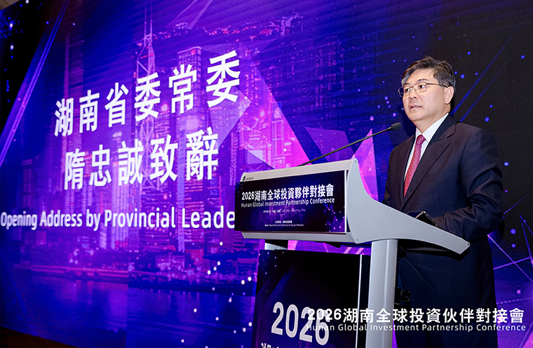 4月22日,“2026湖南全球投资伙伴对接会”在香港隆重举行。湖南省委常委、统战部部长隋忠诚,湖南省委统战部副部长、省政府侨务办公室主任刘卫兵;香港特区政府投资推广署助理署长李淑菁;湖南省商务厅党组成员、副厅长刘素月,湖南省工业和信息化厅党组成员、副厅长欧阳晓风等领导出席会议。湖南省海外联谊会副会长、香港经贸商会副会长、绿之韵集团董事长胡国安与近200家国际金融及投融资机构、商协会、企业、高校科研院所及60余家湖南企业代表参加活动,共促湘港两地高质量融合发展。